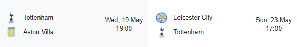 오는 목요일 한국시간 5월 20일 02:00 에 아스톤빌라와 경기를 한다