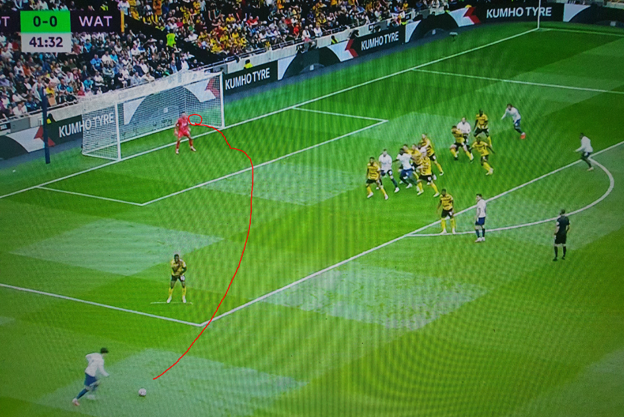 손흥민이 프리킥을 찾으나 아무도 공을 잘라먹지 못했다. 그래도 운좋게 그래로 골!!!!